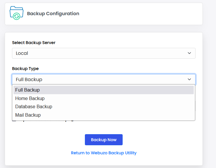 i) Full Backup – to take a complete backup of the webuzo control panel. A full backup will take the backup of the following files.